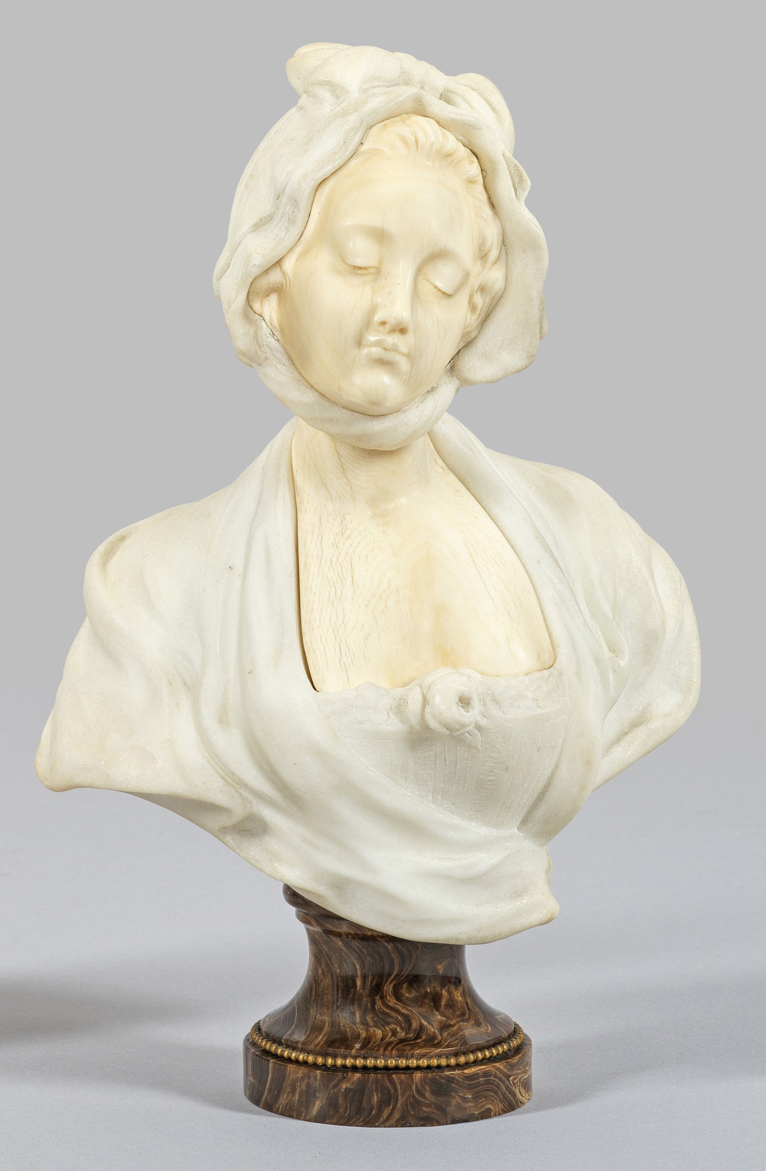 Elfenbein geschnitzt und weißer Marmor; der Sockel aus dunkelbraunem Onyx (oder Marmor), ger. besch.; Sign. mit Ortsangabe Paris. Vollplastische, wohl um 1880-1900 entstandene, subtil ausgeführte Büste eines verträumt blickenden Mädchens (bzw. einer jungen Dame) aus der Epoche König Ludwig XVI. von Frankreich mit Haube und Rose am Dekolleté. Ges.-H. 28,5 cm.