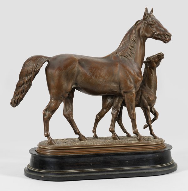 Bronze, dunkelbraun patiniert. Sign.; Guss 19. Jh.; Ebonisierter Holzsockel. Bonheur, einer der bedeutendsten französischen Tierbildhauer des 19. Jhs., schuf mit Vorliebe seine Pferde- und Reiterdarstellungen. Er debütierte 1848 auf dem Salon. 1855 und 1889 nahm Bonheur an den Weltausstellungen in Paris teil und erhielt eine Goldmedaille. In den 1870er Jahren erzielte er auch in der Royal Academy in London große Erfolge. Bronze-H. 49,5 cm, B. ca. 55 cm. Ges.-H. 57 cm.