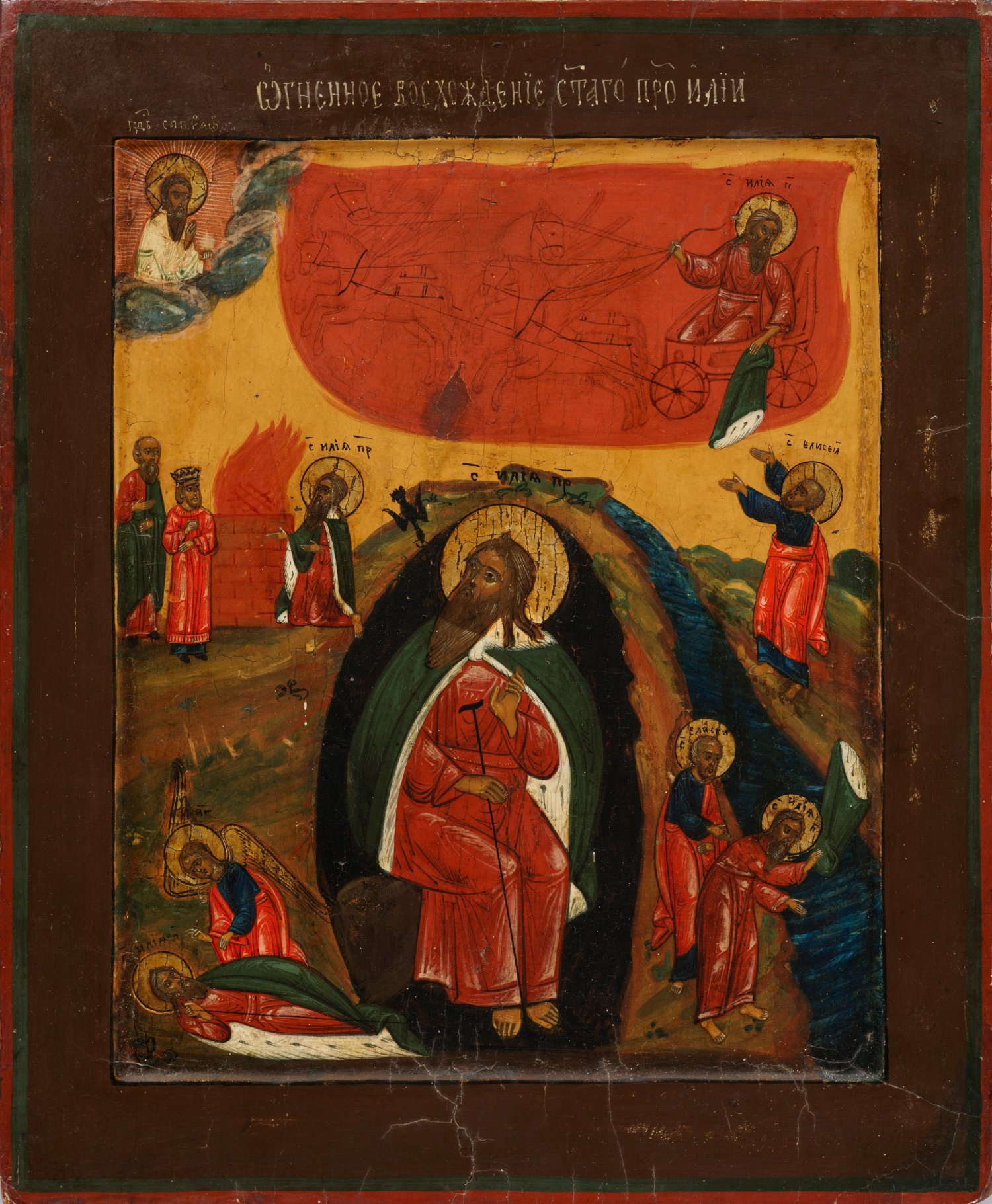 Tempera mit Gold auf Holz. Kowtscheg. Ein rücks. Sponki. Die zentrale Darstellung des Propheten wird umrahmt von Szenen aus seinem Leben und bekrönt von seiner feurigen Himmelfahrt. Links oben der segnende Gott-Vater in den Wolken. Kirchenslawisch bez.; 29,8 cm x 24,7 cm.