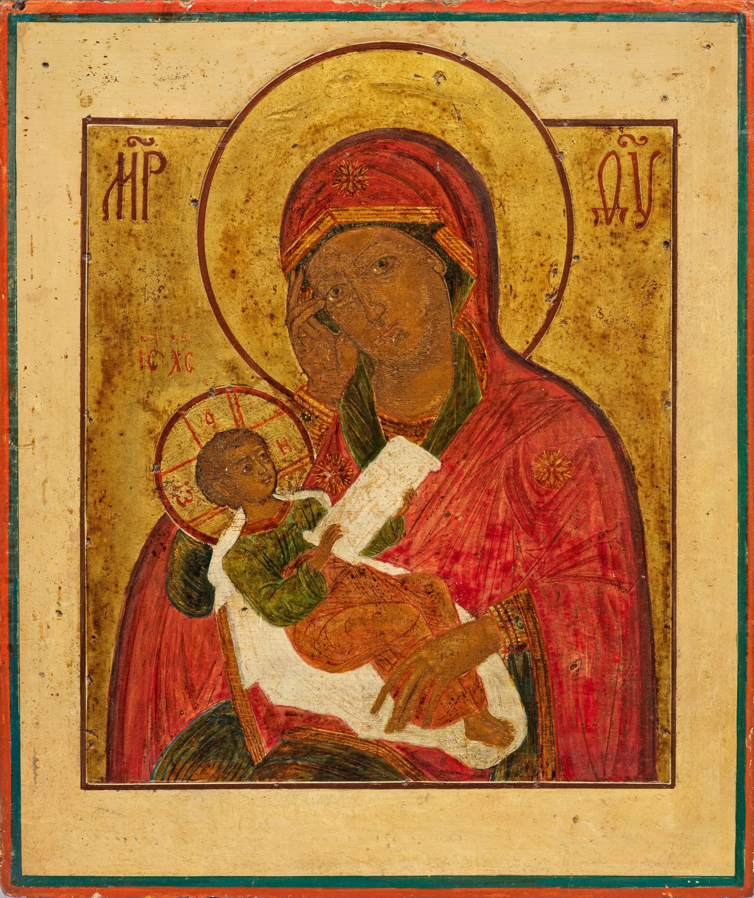 Tempera mit Gold auf Holz. Feine Darstellung Mariens, ihre eine Hand an ihr dem Kinde geneigtes Haupt haltend, die andere Hand über den Beinen des vor ihrer Brust liegenden Kindes, das eine Schriftrolle in den Händen hält. Kirchenslawisch bez.; 33,8 cm x 28,5 cm.