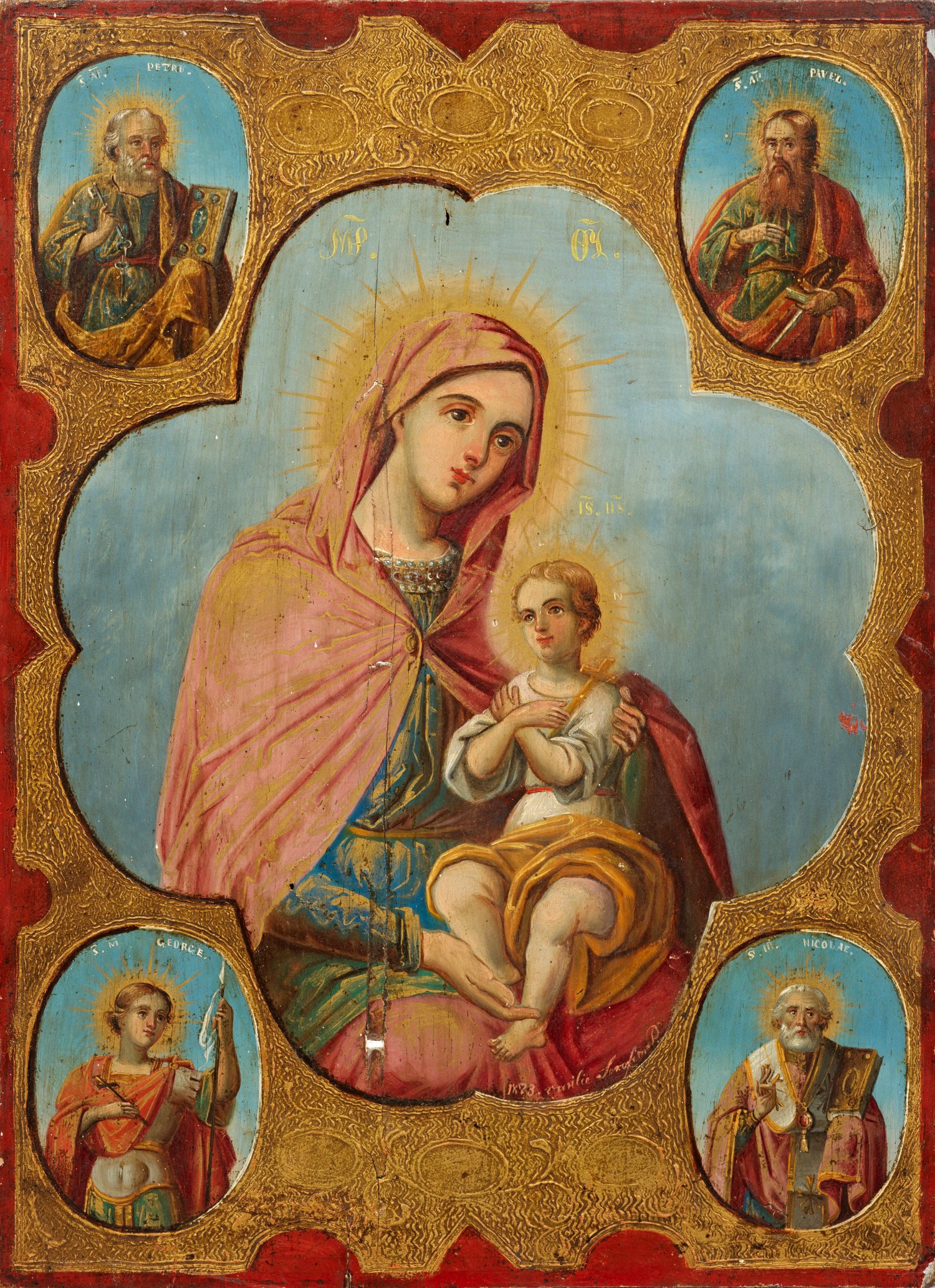 Tempera mit Gold auf Holz. Fein punzierte, passige Goldbordüre. Im Zentrum die Gottesmutter mit Kind, umrahmt von den vier Darstellungen: Hl. Petrus, Hl. Pawel, Hl. Georg und Hl. Nikolaus. Kirchenschlawisch sowie mit Heiligennamen bez., dat. 1873 u. sign. (oder bez.) "Vasilie Serafin D."(?). Ca. 42,2 cm x 31 cm.