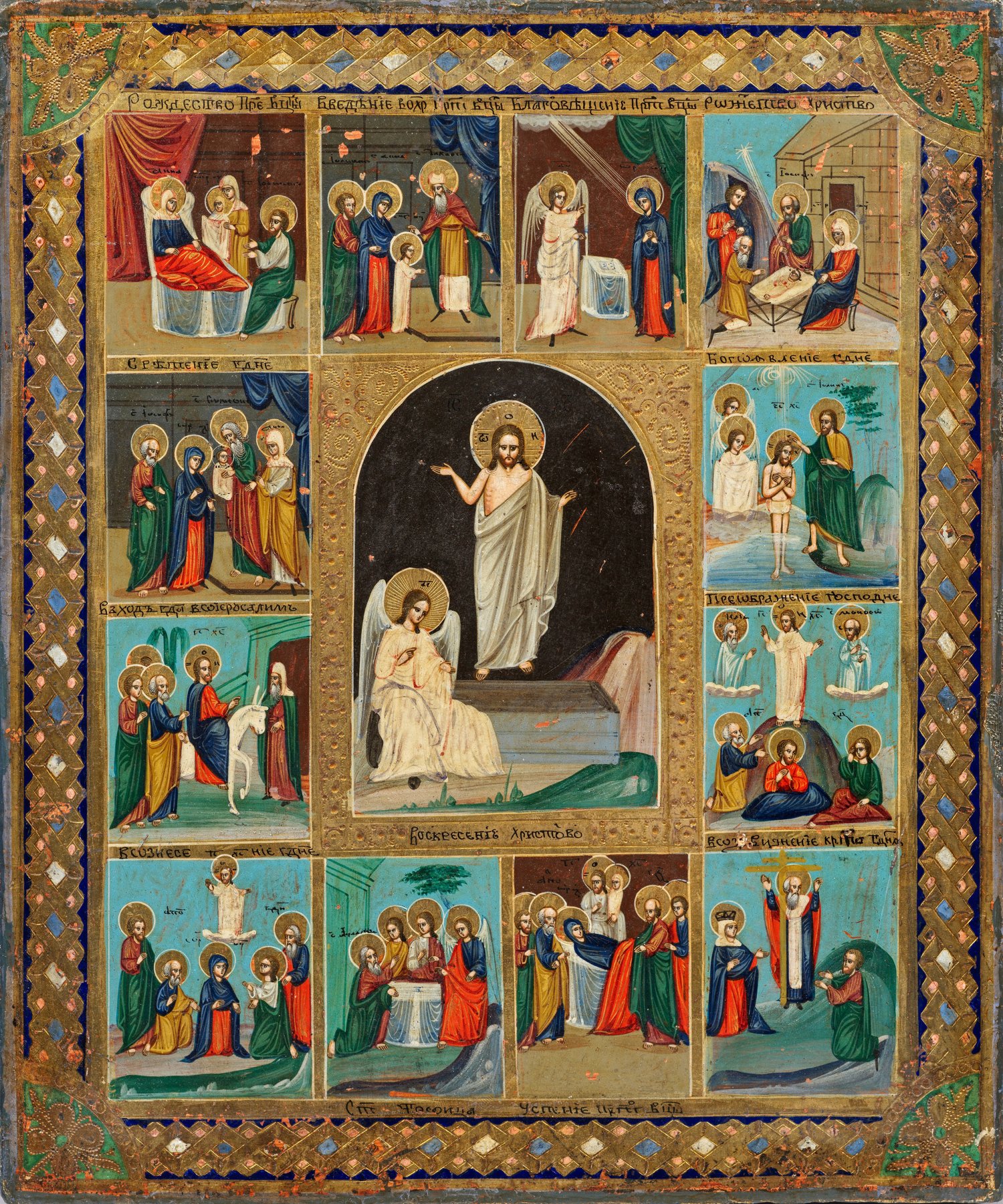 Tempera mit Gold auf Holz. Punzierte und geschnittene Ornamentbänder. Im Zentrum ist das Ostergeschehen, die Auferstehung Christi abgebildet und wird eingefasst von zwölf Darstellungen der wichtigsten Feste des orthodoxen Kirchenjahres. Kirchenslawisch bez.; 31 cm x 26 cm bzw. 27 cm.
