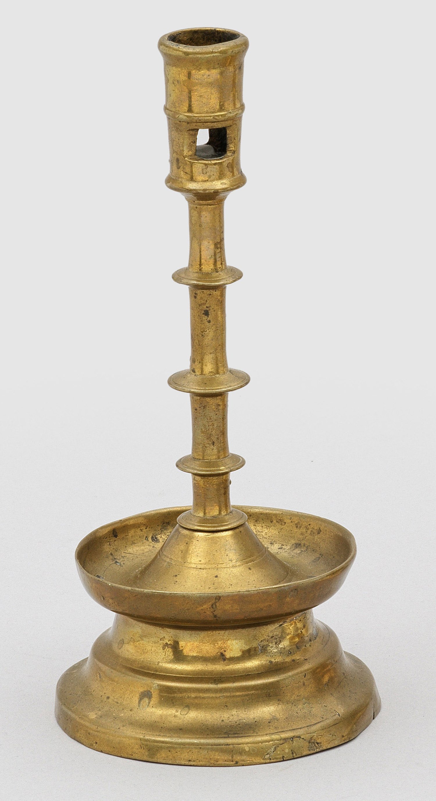Messing. Über rundem, doppelt gekehltem Fuß tief gemuldete Traufschale mit umlaufenden Profillinien. Durch drei gedrückte, profilierte Nodi unterteilter Schaft. Leicht konische, mittig profilierte und durchbrochen gearbeitete Tülle. Stand minim. ger.; Rest.; H. 21 cm.