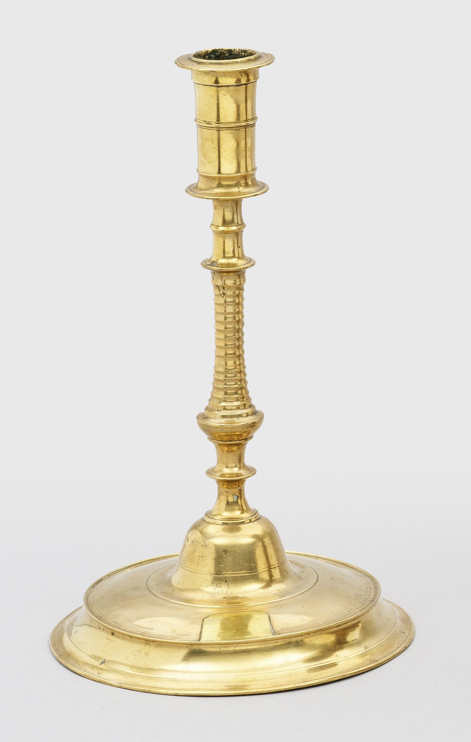 Messing, flacher runder Fuß mit leicht ausgestelltem Standring, umzogen von Profilringen. Über glockenförmigem Ansatz, schlanker, gegliederter und gespulter Schaft sowie zylindrische, mehrfach gegliederte Tülle. Minim. besch.; Rest.; H. 26,5 cm. Stand-D. 16,5 cm.