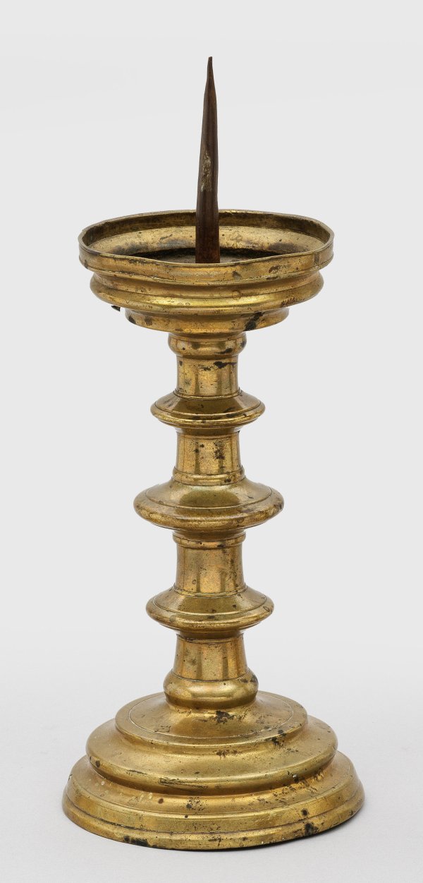 Messing. Über aufgewölbtem, getrepptem Rundfuß Schaft mit Gliederung durch mehrere, abgeflachte, von Profilwülsten abgegrenzte Nodi. Breite, umgekehrt getreppte Traufschale. Innen vernietete Eisenplatte als Kerzenteller, mittig hoher, eiserner Dorn. Best.; H. 34,5 cm.