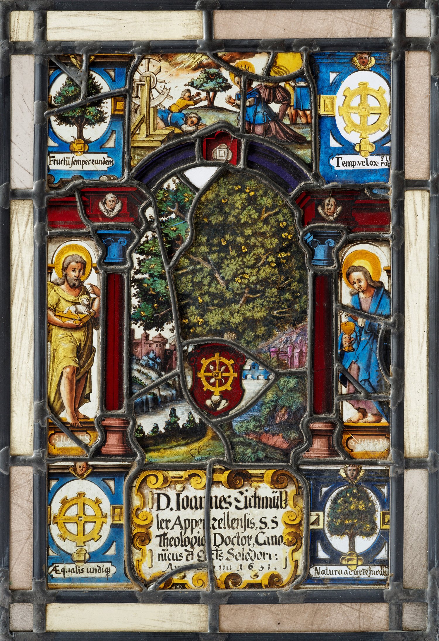Farbloses und farbiges Glas, bemalt in Schwarzlot bzw. polychrom. Hochrechteckige Form. Im Mittelfeld Landschaft mit großem Baum und einem Wappenschild mit Rad-Symbol, flankiert von dem Hl. Johannes dem Täufer und dem Hl. Johannes dem Evangelisten, in den Zwickeln korrespondierende Baum- und Rad-Motive mit lateinischen Inschriften. Unterhalb Nameninschrift in Rollwerk- bzw. Beschlagwerkartusche: "D. Joannes Schmützler Appenzellensis, S.S Canonicus (...) Anno Domini 1631 (oder 1651). Oberhalb szenische Darstellung des Martyriums der Hl. Katharina. Sign. mit Monogramm. Minim. besch.; 37 cm x 25,5 cm.