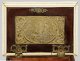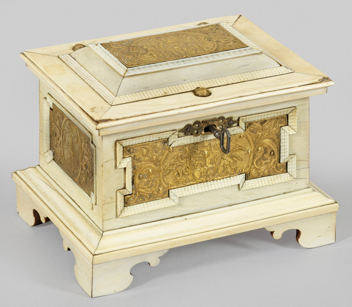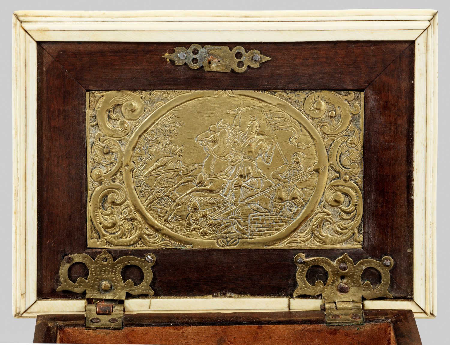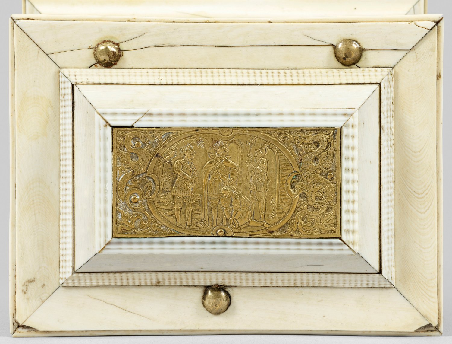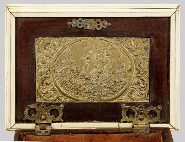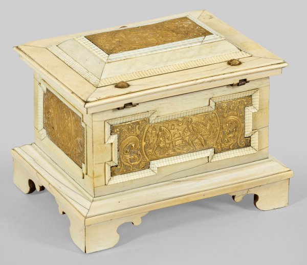 Holzkorpus mit flächendeckendem Fond aus Elfenbein sowie Plaketten aus graviertem und vergoldetem Messing. Querrechteckig angelegter Korpus auf profilierter Zarge sowie gesägten Füßen. Weit überstehender, gestuft ansteigender Deckel. Allseitig von Flammleisten begrenzte Reserven mit eingelassenen Plaketten. In der Mitte jeweils unterschiedliche Medaillons mit Rittern und Edelleuten, flankiert von Drachen und üppigen Voluten. Schauseitig graviertes Wappen mit Helmzier. Innen korrespondierende Darstellung mit Schlachtenszene sowie unterhalb Reste eines Papieretiketts "Nr.92". H. 11 cm. 14,5 cm x 11 cm.