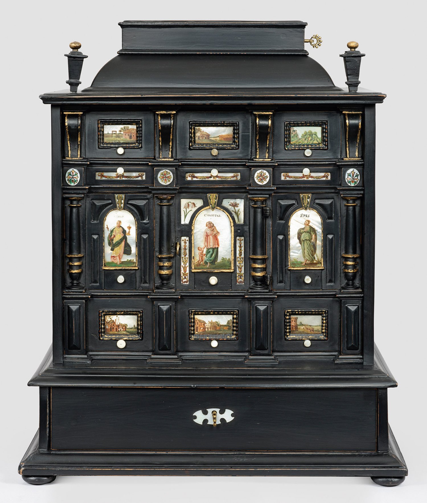 Holz, schwarz gefasst und teilw. vergoldet sowie Perlmutter, polychrom bemalt. Über einschübigem, profilierten Zargensockel und gedrückten Füßen, rechteckiger Korpus mit geschweift ansteigendem, podestförmigem oberen Abschluss mit Lade. In der architektonisch gegliederten Front zentrale Tür, umgeben von diversen Schubfächern unterschiedlicher Größe. Eingelassene Perlmuttplaketten mit weiblichen, allegorischen Figuren sowie Landschafsdarstellungen. Rest.; H. 49,5 cm. 41 cm x 25 cm.