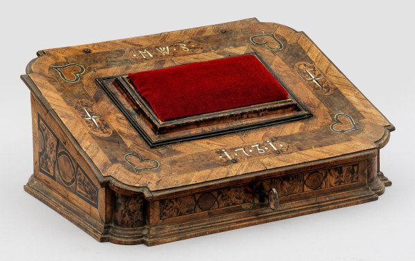 Nussbaum, furniert sowie Einlagen aus Elfenbein und Zinn. Querrechteckig angelegter Korpus mit gerundeten Ecken auf schmaler Profilzarge. Schräggestellter Deckel mit zentral eingelassenenem Nadelkissen sowie Faltsternen und Herzen. Monogramm M.W.S. sowie 1731. Innen Papierauskleidung, Ablagefach und Geheimschubladen. H. 15 cm. 38 cm x 30 cm.