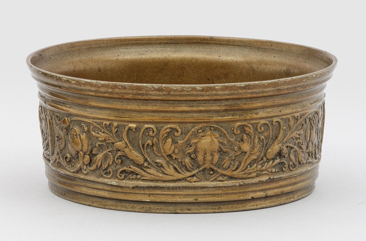 Messing, gegossen. Runder, zylindrischer Korpus über breitem, profiliertem Stand. Auf der Wandung umlaufender, breiter Relieffries mit Akanthusblattranken, Blüten, Früchten und Puttenmaskarons. H. 7 cm. D. 15,5 cm.