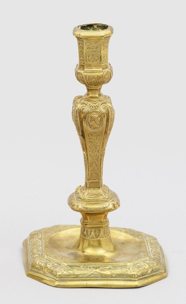 Messing. Quadratische Grundfläche mit abgeschnittenen Ecken. In Fuß integrierte runde Tropfschale, darüber viereckiger Balusterschaft und über schmalem Ansatz leicht ausschwingende Tülle. Fuß, Schaft und Tülle reliefiert mit Voluten, Muscheln, Blattranken, Hafren und vier verschiedenen Profilmedaillons. Tropfschale graviert mit Wappen, ausgerissener Baum unter Grafenkrone. H. 22 cm.