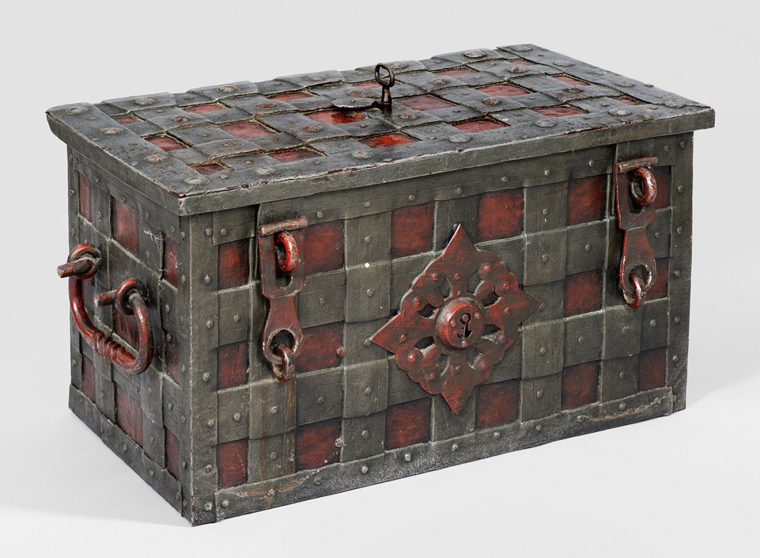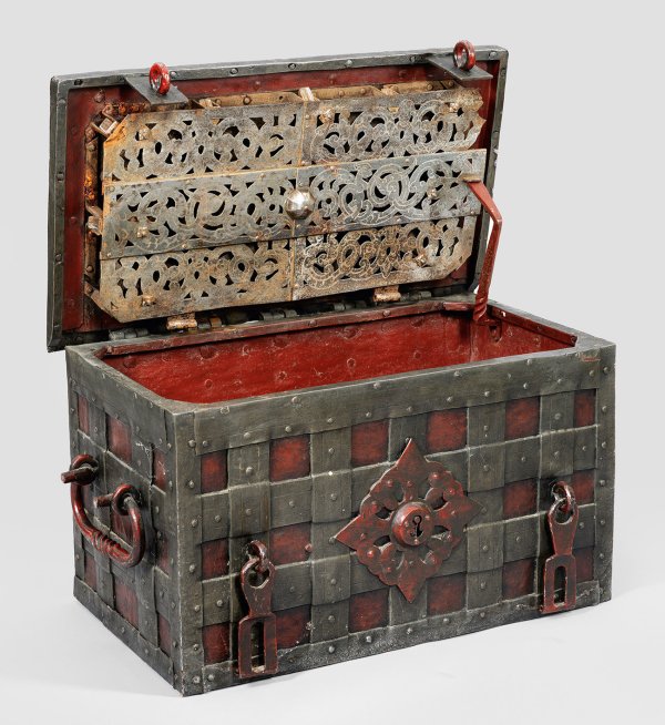 Eisen, geschmiedet und teilw. rot lackiert. Rechteckiger Korpus mit flachem Scharnierdeckel und seitlichen Tragegriffen. Korpus und Deckel mit breiten, über Kreuz vernieteten Bandbeschlägen. Frontseitig zwei Haspen und ein aufgelegtes Kartuschenmotiv mit Scheinschloss. Zentrales Schloss auf dem Deckel. Rot gefasste Innenwandung, am Boden ein weiteres verschließbares Fach. Auf Deckelinnenseite die durchbrochen gearbeitete Schlossabdeckung mit ziseliertem Blattrankendekor sowie zehn Zuhaltungen. H. 42,5 cm. 79 cm x 44,5 cm.