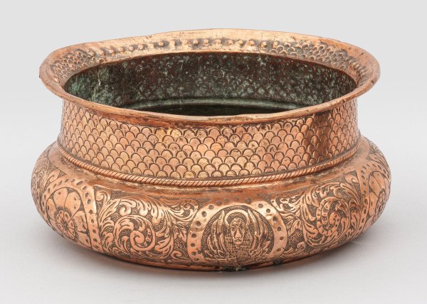 Kupfer. Bauchig, mit zylindrischem Hals und ausgestelltem, außen gebördeltem Rand. Reich getrieben und punziert mit Schuppenmuster an Hals und Rand. Auf der Wandung Blattranken und in ovalen Kartuschen ein Dogenporträt, Wappen und Markuslöwe. Besch.; H. 14,5 cm. D. 34 cm.