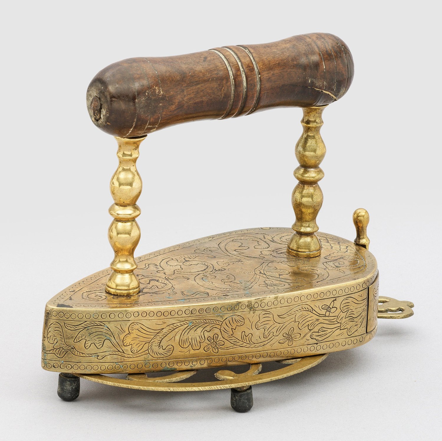 A German brass iron engraved with flowers and leaves, monogrammed "STS". In addition a coaster, added later.