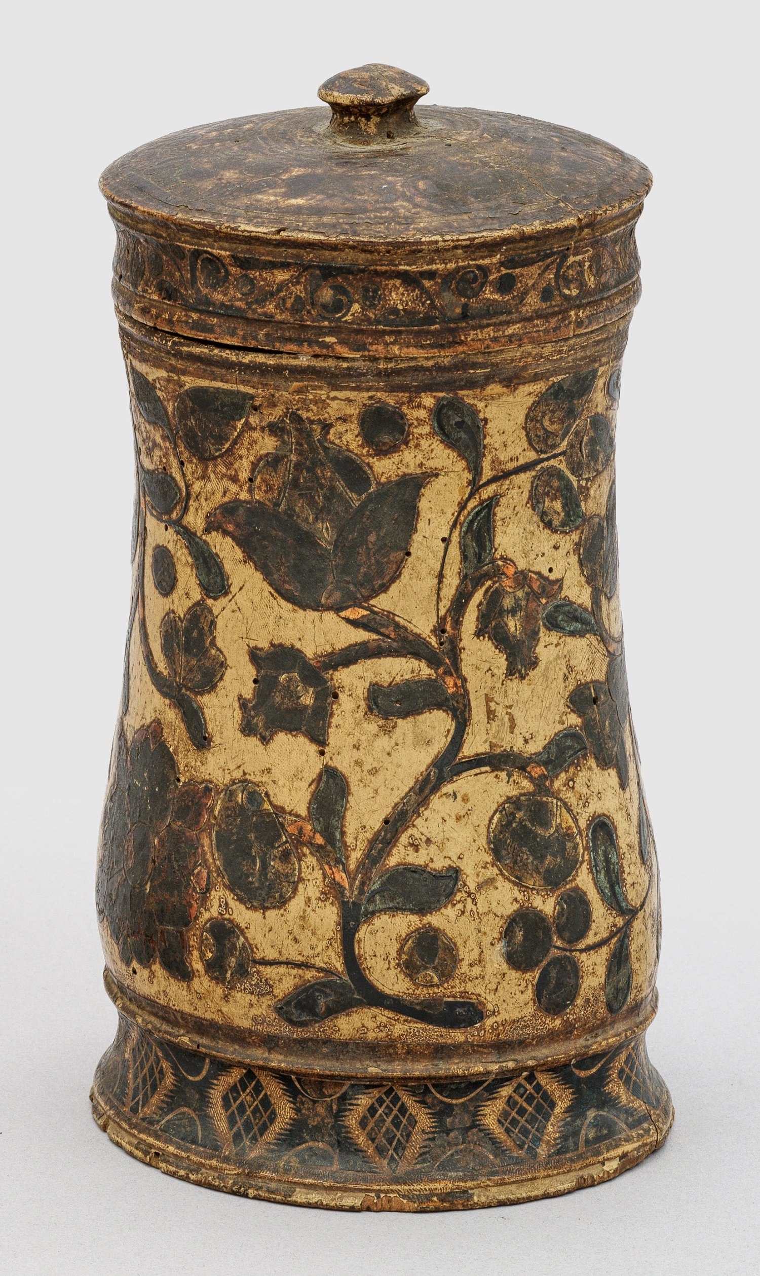 Holz, gedrechselt und polychrom gefasst. Über flachem Stand annähernd zylindrische, leicht balusterförmige Form mit leicht eingezogenem Fuß und am Rand profiliertem Stülpdeckel, bekrönt von gerundetem Scheibenknauf. Wandung und Deckel mit Resten polychromer Bemalung auf leicht reliefiertem Blütendekor. Ber.; wurmstichig. H. 22,5 cm. D. 11,5 cm.