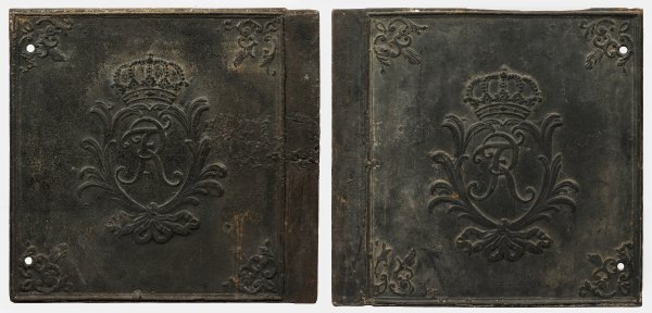 A pair of cast-iron stove plates with the ligated monogram of Frederick the Great. Partly torn.