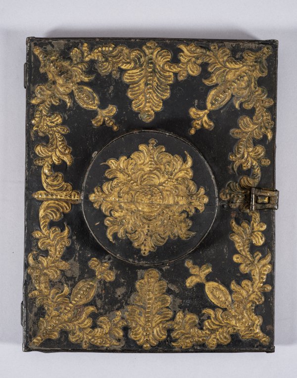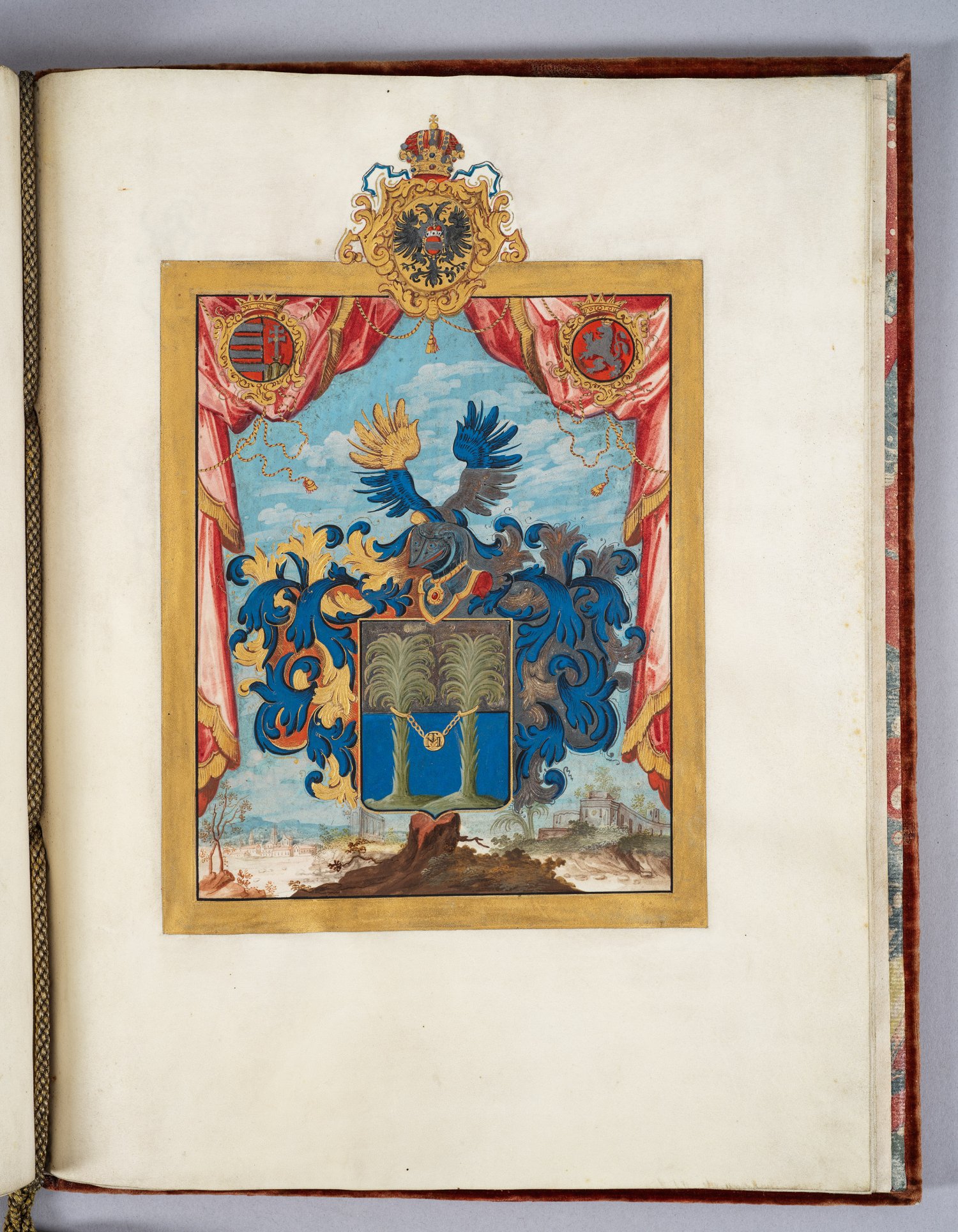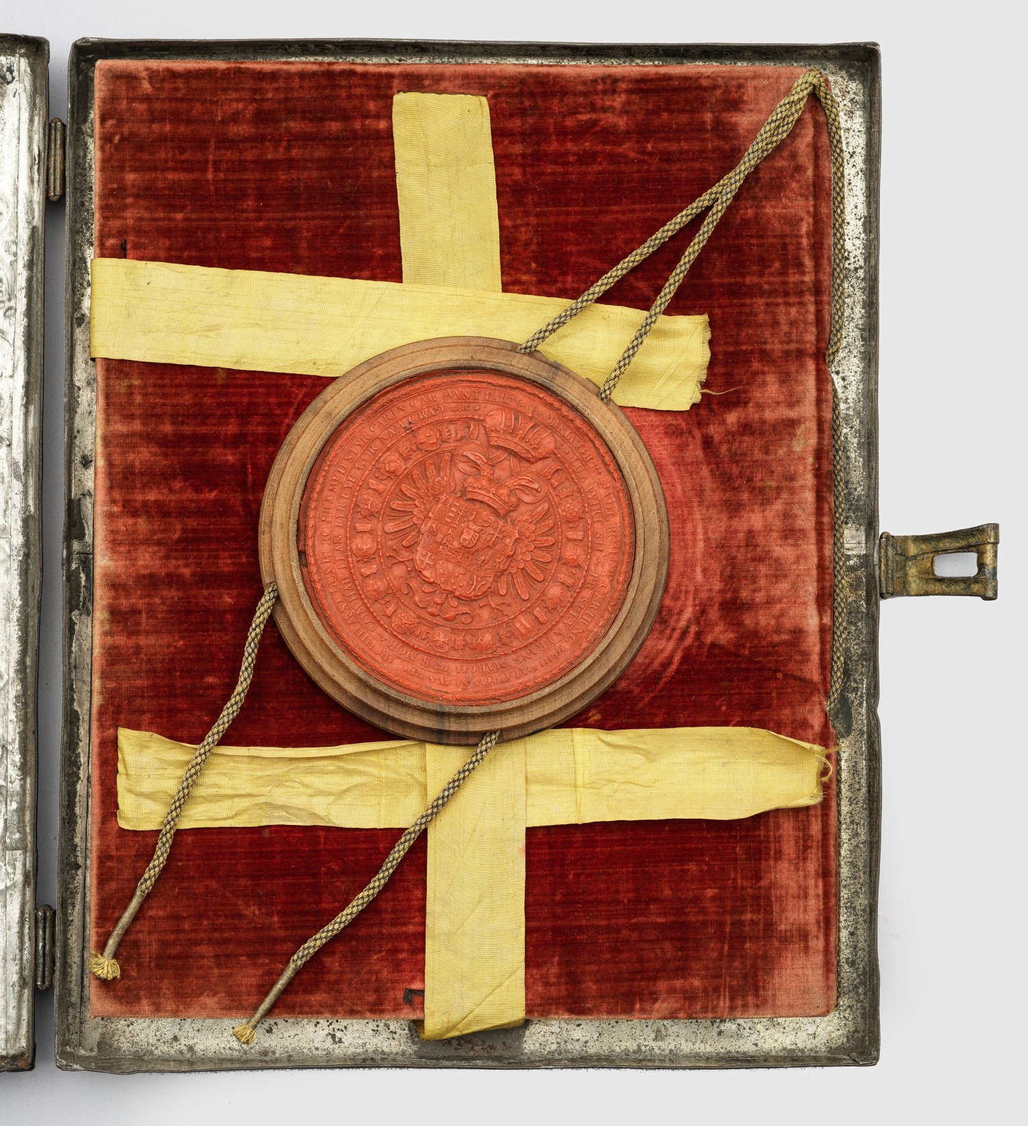14 Blatt Pergament, eingebunden in roten Samt mit goldenen Verschlussbändern sowie an goldgewirkter Kordel angehängtem, großen Siegel in gedrechseltem Holzrahmen. In originaler Metallkassette, innen verzinnt, mit reliefiertem und außen golden bemaltem Pflanzendekor. Handschrift in Schwarz auf Pergament mit kalligraphischen Überschriften. Auf einer Seite Darstellung des neuen Wappens des Geadelten in polychromer Malerei, auf einer anderen die Unterschrift der Kaiserin. Alters- und Gebrauchsspuren. 39 cm x 31,5 cm x 7 cm.
