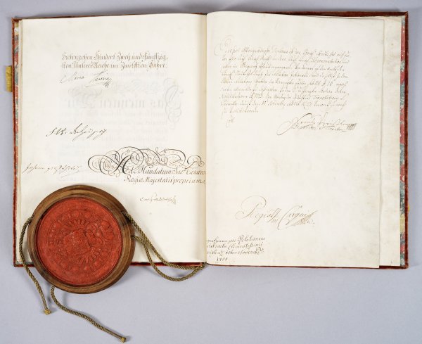 A patent of nobility from Empress Maria Theresia for Mathias Frantz Jonak von Freyenwald. 14 pages, including a painting of the coat of arms and a signature of the Empress. Attached a big seal. Original box. Signs of age and use.