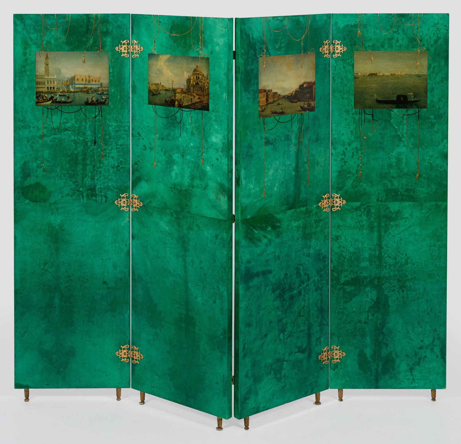 4-tlg.; Hochrechteckige, flache Paneele auf Balusterfüßen. Beidseitig flächendeckender Fond aus smaragdgrün gefärbtem, lackiertem Ziegenleder. Schauseitig unterschiedliche Ansichten Venedigs sowie zarter Draperiedekor in Gold. Ornamentierte Scharniere. Unbez.; Pro Paneel: 165,5 cm x 50 cm.