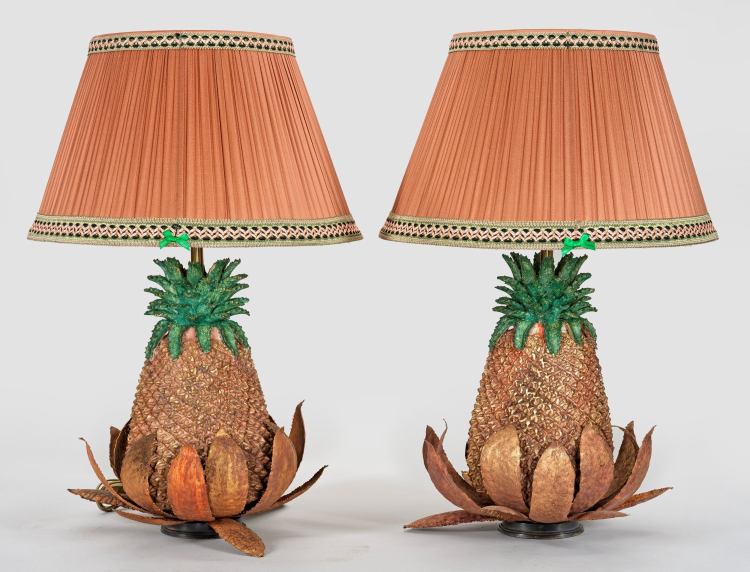 1-flg.; Metall und Keramik, grün und roséfarben bemalt bzw. vergoldet. Naturalistisch gestaltete Ananas auf Blattwerk. Schlanker Schaft als Träger für Leuchtmittel sowie konischen Lampenschirm. Elektrifiziert. H. 73 cm.