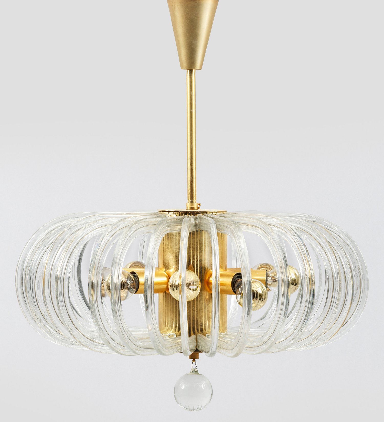 8-flg.; Messing und farbloses Kristallglas. Offen gestalteter Korpus aus stark gebogten, gereiht angeordneten Streben. In der Mitte zylinderförmiger Schaft als Träger für Leuchtmittel. Kugelabschluss. Elektrifiziert. Entw. Cari Zalloni, 1960er Jahre. H. 46 cm. D. 50 cm.