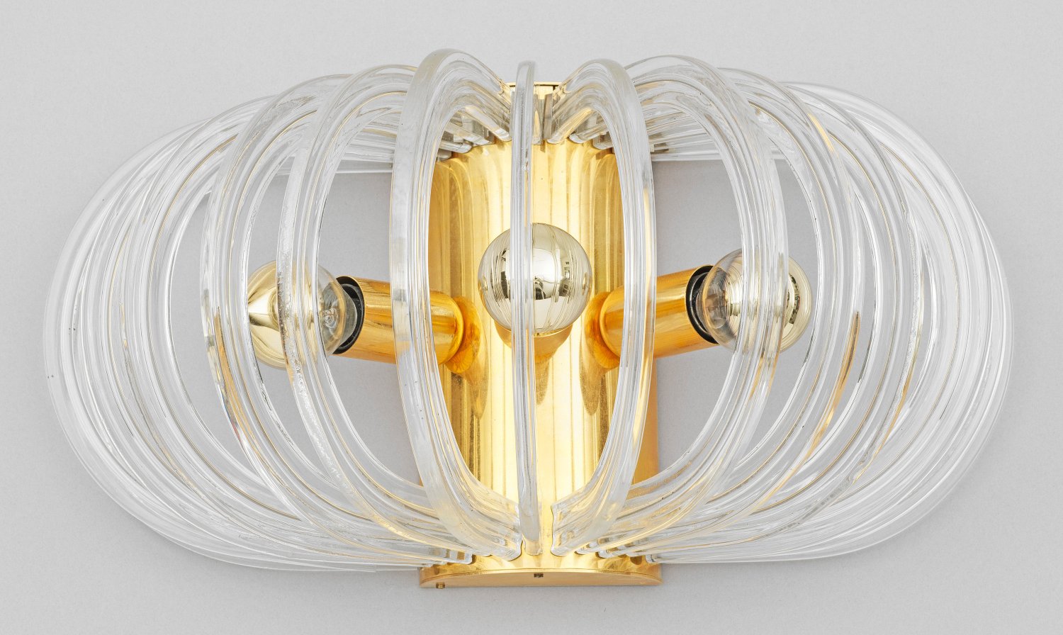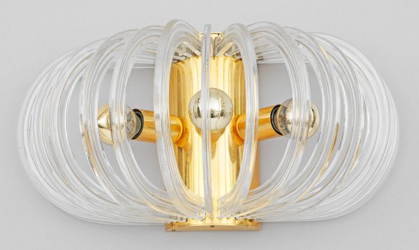 3-flg.; Messing und farbloses Kristallglas. Offen gestalteter Korpus aus stark gebogten, gereiht angeordneten Streben. In der Mitte gerundetes Wandschild als Träger für Leuchtmittel. Elektrifiziert. Entw. Cari Zalloni, 1960er Jahre. H. 20,5 cm.