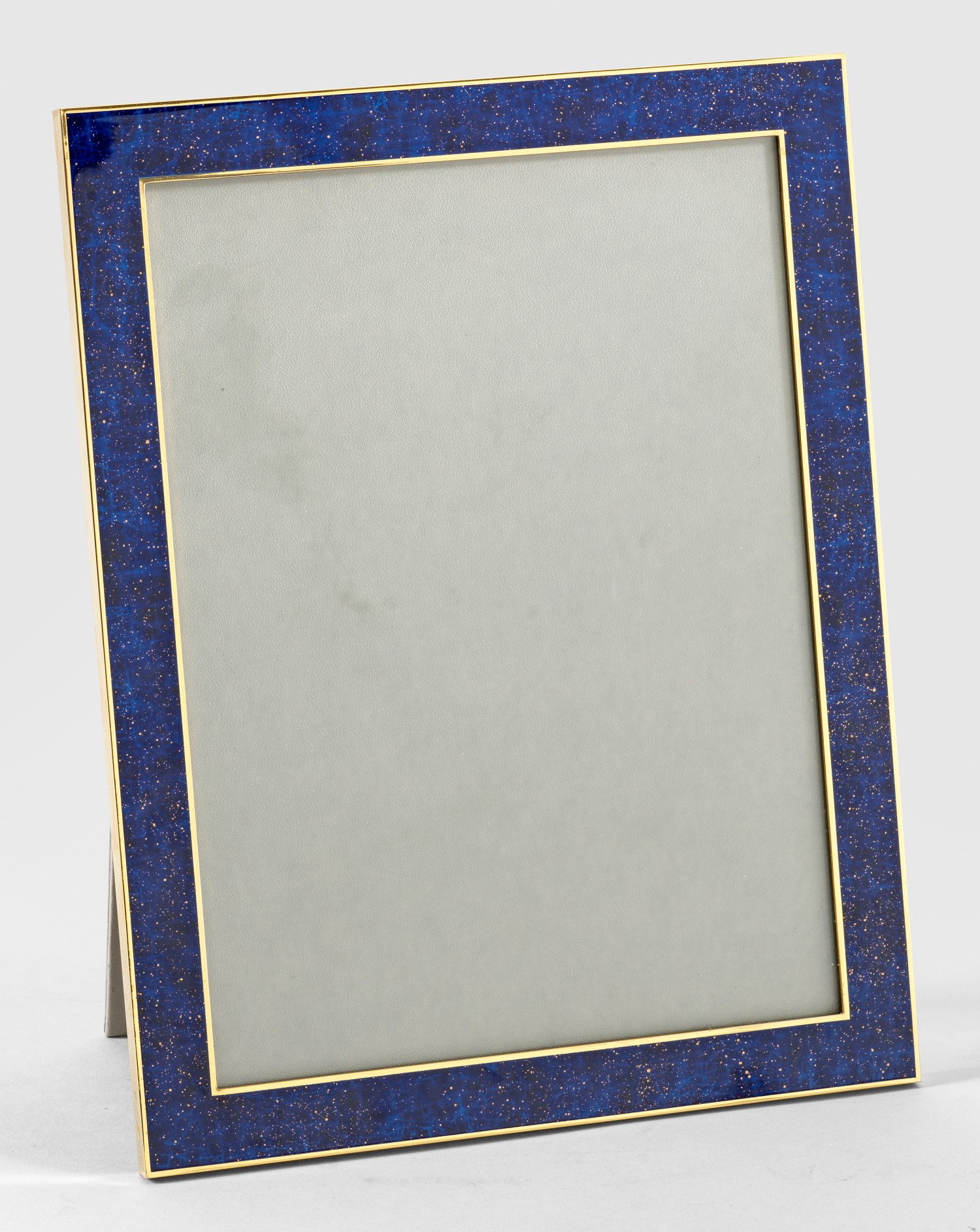 Metall, emailliert. Hochrechteckig. Breiter Rand lapislazulifarben emailliert. Rückseitig aufstellbar. Gem., Herstellermarke. 27 cm x 21 cm. Bildausschnitt 23 cm x 17 cm.