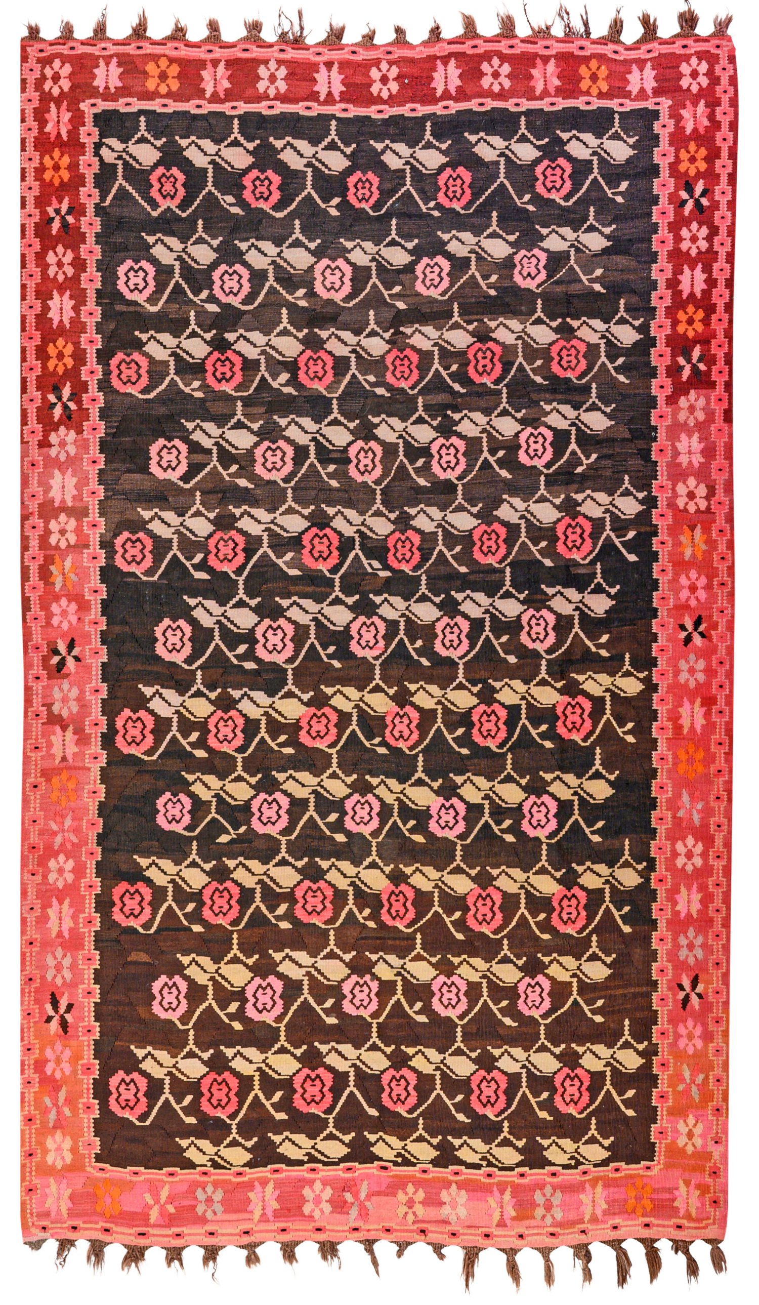 Türkei. Mitte 20. Jh.; Wolle auf Wolle, flach gewebt. Im braunabraschierten Innenfeld flächendeckende Musterung aus stilisierten Rosenblüten im Rapport. Umlaufend hellrote Bordüre mit Rosetten. 223 cm x 354 cm.