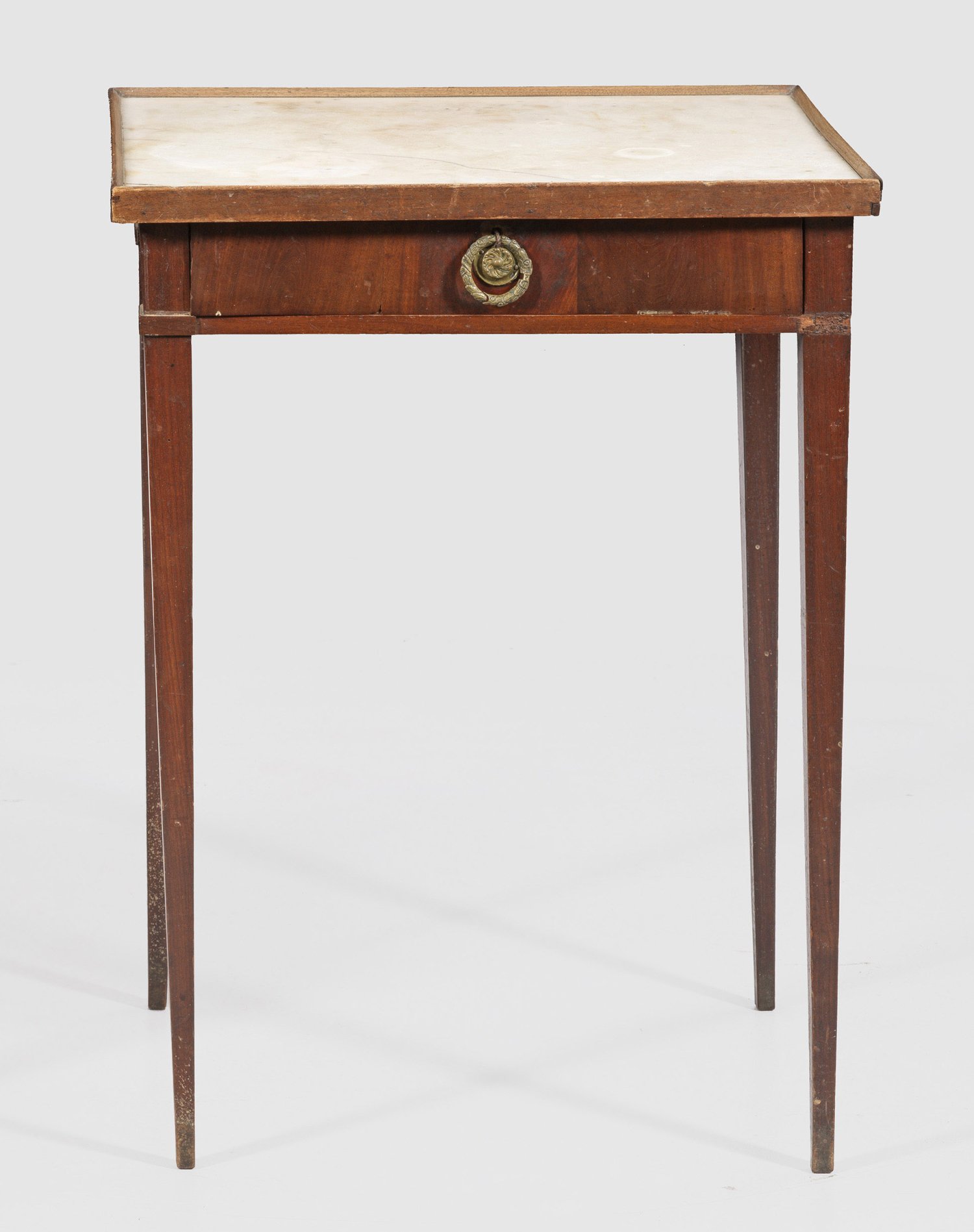 Mahagoni, furniert. Gerader, einschübiger Zargenkasten auf hohen, spitz zulaufenden Vierkantbeinen. Gering überstehende Deckplatte aus weißem Marmor. In der Schublade kleines Papieretikett, bez. "Z.12 79". Altersspuren. H. 76,5 cm. 57,5 cm x 43 cm.
