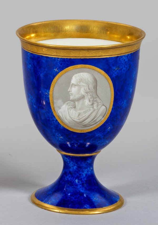 Über dem eingezogenen Rundfuß kelchförmig gewölbter Korpus mit leicht ausschwingender Mündung. Flächendeckender Fond der farbenkräftigen Steinimitation des Lapislazuli. Zentrales Medaillon mit Reliefgoldkontur. Darin das fein nuancierte Profil Jesu Christi in Grisaille-Technik. Der Rand mit umlaufender, teilw. goldradierter Bordüre. Polychrome Malerei mit reicher Goldstaffage. Minim. best.; Zeptermarke. H. 17,5 cm.
