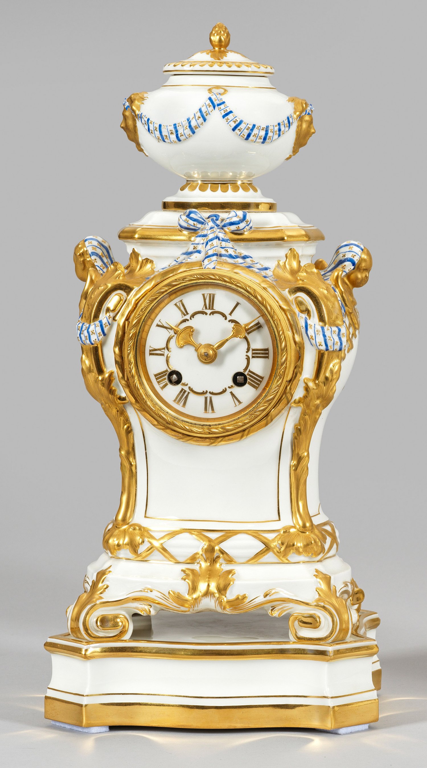 Porzellan. 2-tlg.; Rechteckiger, geschweifter, an den Ecken abgeflachter Profilsockel. Auf vier gedrückten Blattvoluten architektonisch gegliederter Balusterkorpus, bekrönt von einer ovalen, bauchigen Deckelvase. Allseitiger Reliefdekor aus ausgezogenen, blattreliefierten Ecklisenen, Cherub- und weiblichen Maskaronköpfen, goldornamentierter, blau-weißer Tuchdraperie, Gitterwerk und Kreuzbandbordüre. Reiche Goldstaffage mit Goldradierungen. Verglastes Porzellanzifferblatt mit römischen Zahlen. Vergoldete Messinglünette sowie -zeiger. Halbstundenschlag auf Glocke. Platine bez. "Lenzkirch AGU 1 Million" mit Serien-Nr. 9830028. Entw. Um 1775. Modell-Nr. 635. Jahresbuchstabe. Zepter- und Malereimarken. H. 35 cm.