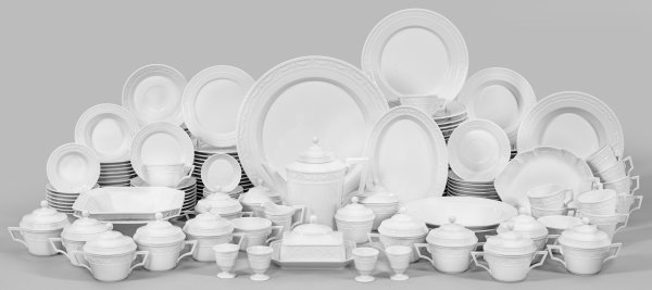 Weißporzellan. 125-tlg.; Kaffeekanne, Zucker- und Butterdose, Sahnegießer, 8 Kaffee- und 3 Teetassen mit Untertassen, Tortenplatte, 21 Speise-, 3 Suppen-, 10 Brot-, und 16 Kuchenteller, 14 Suppentassen mit 17 Untertassen, 4 Butterplättchen, 12 Dessert-, 8 Konfekt- und 11 Salatschälchen, 4 Eierbecher, 2 runde, 2 eckige und 1 ovale Anbietschale, Blattschale. Sog. "Kurland" (bzw. "Kurländer Muster"). Klassizistische Form mit feinem Reliefdekor. Umlaufende Bordüre mit Perlschnur und Tuchgehänge. Ein Kuchenteller mit best. Rand und Haarriss, ein Suppentassendeckel fehlt. Zeptermarke. Beigabe: Kuchenteller mit korrespondierendem Dekor, 12 Packungen Stapeldeckchen. Kannen-H. 22 cm. Teller-D. 15,5 cm - 25,5 cm. Max. Platten-D. 37 cm.
