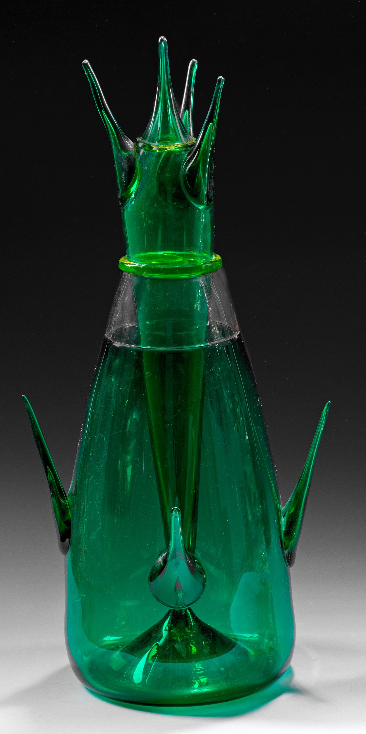 2-tlg.; Farbloses und grünes Glas mit gelben Bandauflagen und spitz ausgezogenen Glasauflagen, die an Stacheln erinnern. Deckel abnehmbar. Entw. Franz Prati für Pauly & Cie, 1990. Sign. und monogr.; Ges.-H. 49,5 cm.