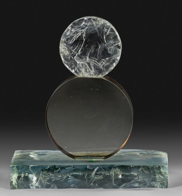 Farbloses und rauchgraues Glas. Firmen-Ritzsign. mit Auflage 34/500. H. 26,5 cm, 25 cm x 9 cm.