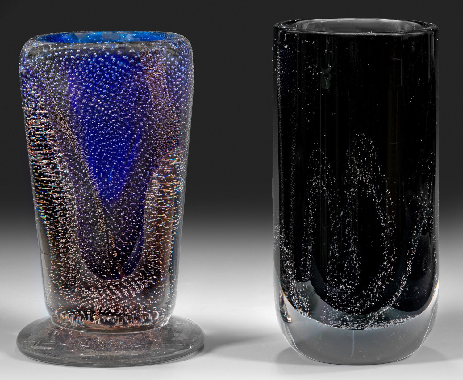 Dickwandige Kelchvase aus farblosem Glas mit zahlreichen, kleinen Luftblasen-Einschlüssen. Unterfang in Blau mit zersprengter Goldfolie. Technik und Qualität erinnern stark an die Arbeiten "a bollicine (oro)" von Flavio Poli. Dickwandige Stangenvase aus auberginefarbenem Glas mit kleinen Luftblasen-Einschlüssen, im unteren Bereich einen Stern bildend. H. 20 cm - 29,5 cm.