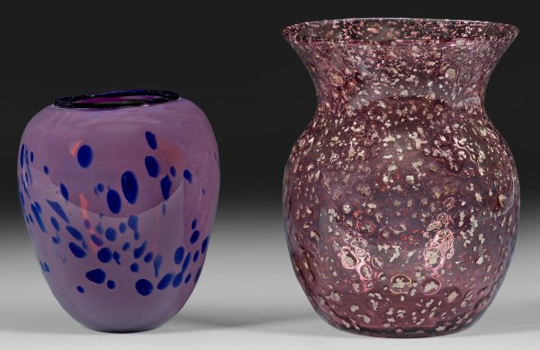 Farbloses Glas mit Unterfang in Blasslila und blauen Dot-Einschmelzungen. Abschluss ebenfalls in Blau. Form und Technik erinnern stark an Erwin Eisch. Zweite Vase aus lilafarbenem Glas mit Einschmelzungen von Luftblasen und zersprengter Silberfolie. H. 15,5 cm - 20 cm.