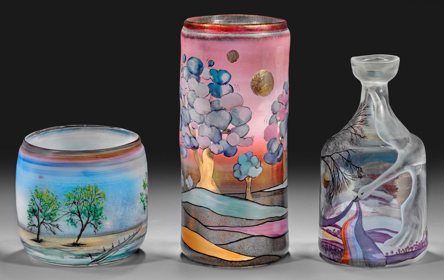Eine hohe und eine niedrige Stangen- sowie eine Flaschenvase. Farbloses Glas, Überfänge in Pastellfarben mit Baumlandschaften, teilw. leicht irisierend. Jeweils Sign. "Eisch", dat. "90" bzw. "91", jeweils monogr. "J.S.", "M.S." und "J.E.". H. 12,5 cm - 24,5 cm.