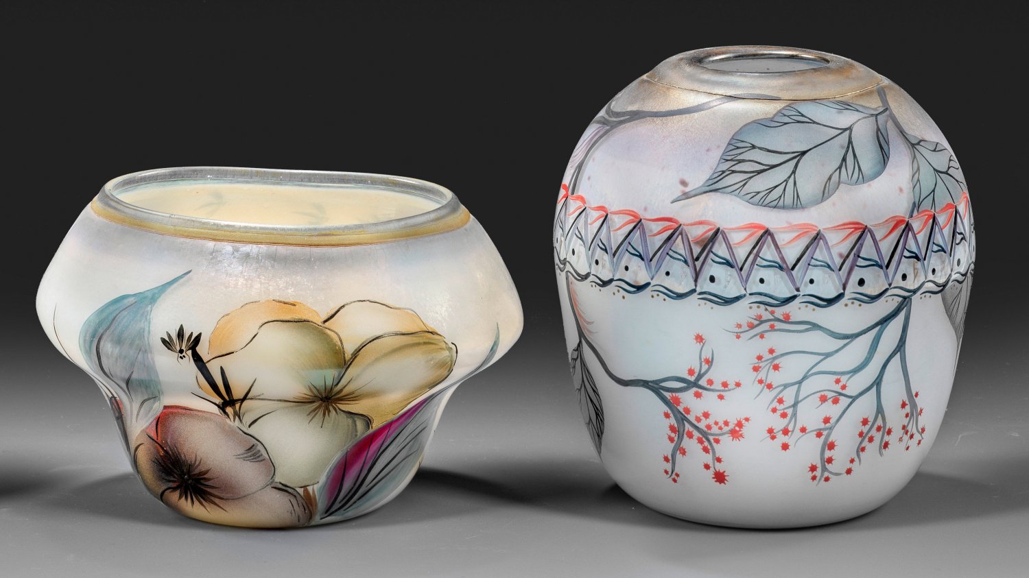Milchiges Glas. Überfänge in Gold, Schwarz, Grün, Rot und Violett, teilw. leicht irisierend. Jeweils Sign. "Eisch", dat. "90" und "96", monogr. "S.Y." und "S.R.". H. 10,5 cm - 15 cm.