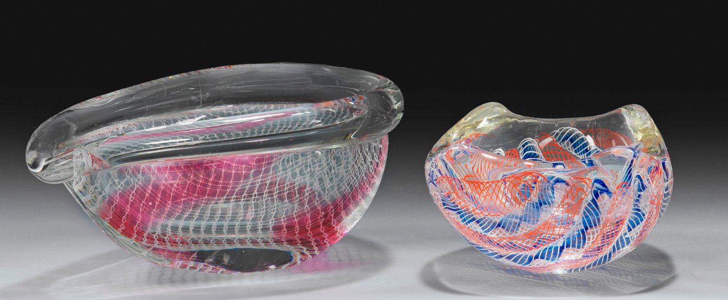 Farbloses Glas, feine Bandeinlagen in Weiß, Rot, Blau, teilw. "Zanfirico"-Technik. Schalen-L. 10 cm- 16 cm. H. 6 cm - 7,5 cm.