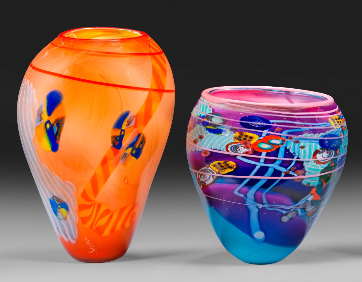 A set of two US-American glass vessel vases by Wes Hunting. Signed.