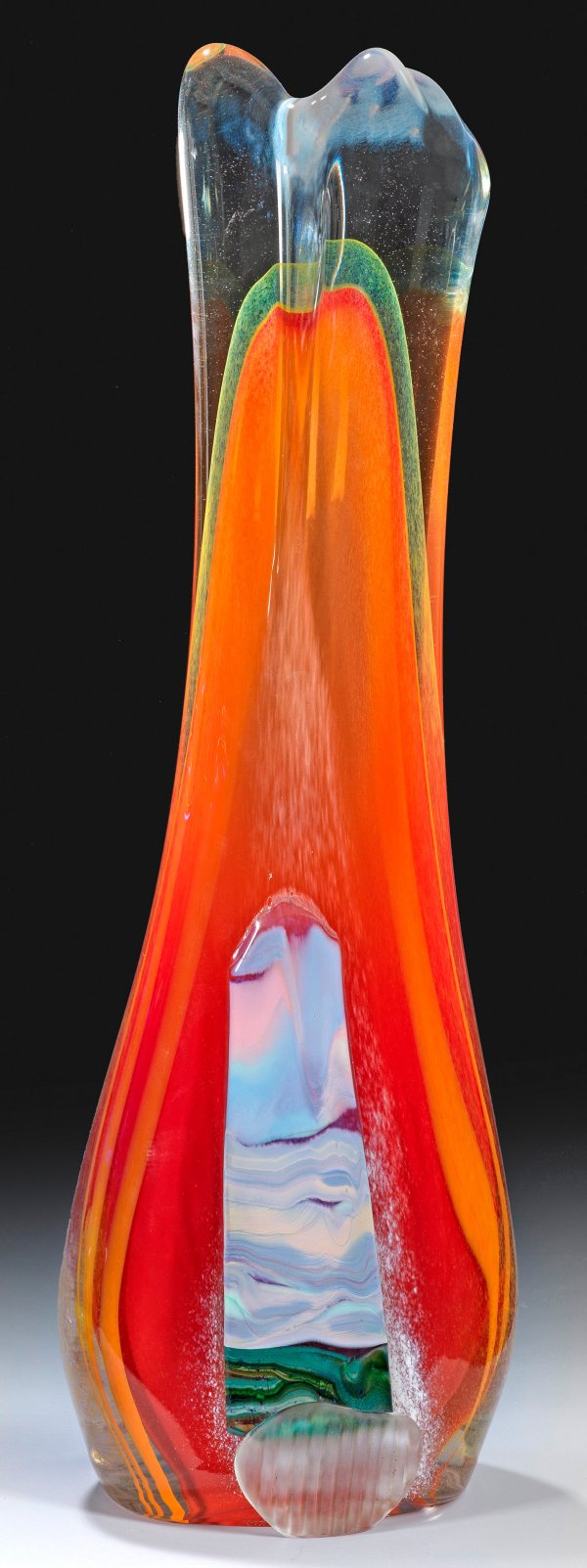 Farbloses Glas über Orange und Gelb im Verlauf. Aufschmelzungen in Weiß-, Blau-, Lila- und Grüntönen sowie farbloses Glas mattiert. Ritz-Sign., betitelt und dat. 1987. H. 60 cm.
