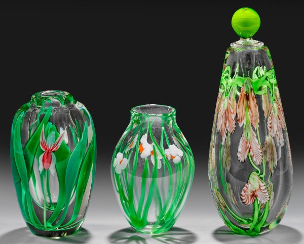 Farbloses Glas. Blumen-Einschlüsse in Grün, Bordeaux, Orange, Weiß und Pink. Sign. "Walkoft" und dat. "1983" sowie "S. Beyers", betitelt "Orient & Flume" und nummeriert "0017W60F626". H. 13 cm - 23,5 cm.