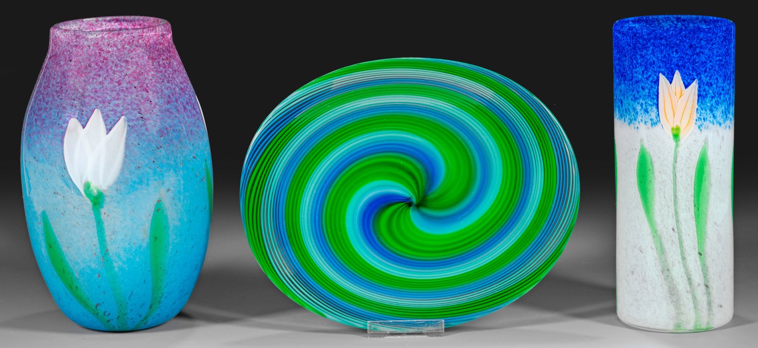 Farbloses Glas mit Bandeinschmelzungen in Hell- und Dunkelblau sowie Grün, spiralförmig verlaufend, zur Mitte hin sich treffend. Zwei Vasen aus farblosem Glas mit schaumig anmutendem Unterfang in Blau, Lila und Weiß, darüber Tulpen. Schalen-L. 24,5 cm. H. 13,5 cm - 22,5 cm.