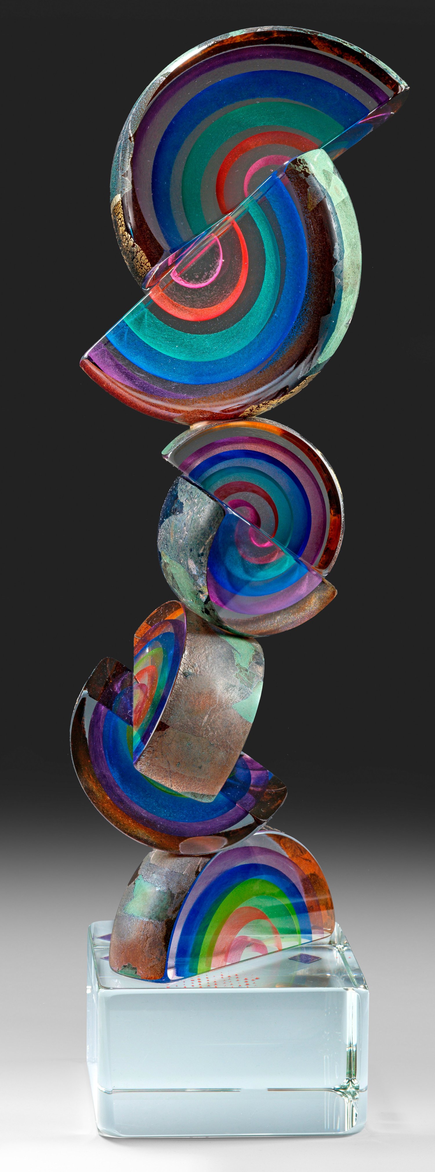 Drei in der Mitte geteilte und versetzt wieder zusammengesetzte, starke Glasscheiben, aufgesetzt auf einem weiteren Halbkreis, darunter klarer Glaskubus. Farbloses Glas mit Einschlüssen als Halbkreise in Lila, Blau, Grün und Rot. Zersprengte Gold- und Silberfolie auf der leicht irisierenden Oberfläche. Sign.; H. 72 cm.
