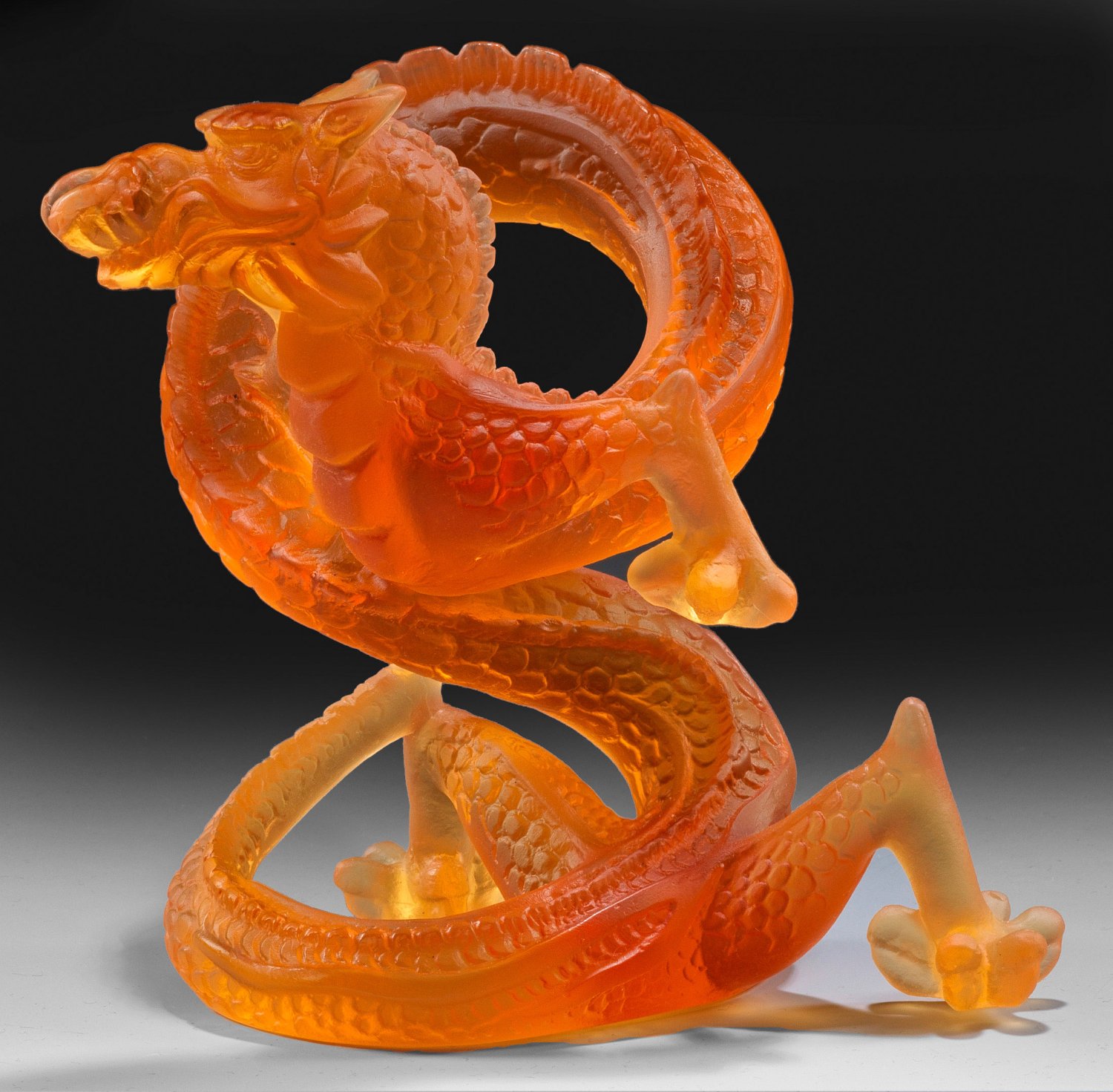 Bernsteinfarbenes Glas in Pâte de verre. Der Drache in Achtform ist ein chinesisches Glückssymbol. Sign. "Daum France", nummeriert 963. H. 12 cm.