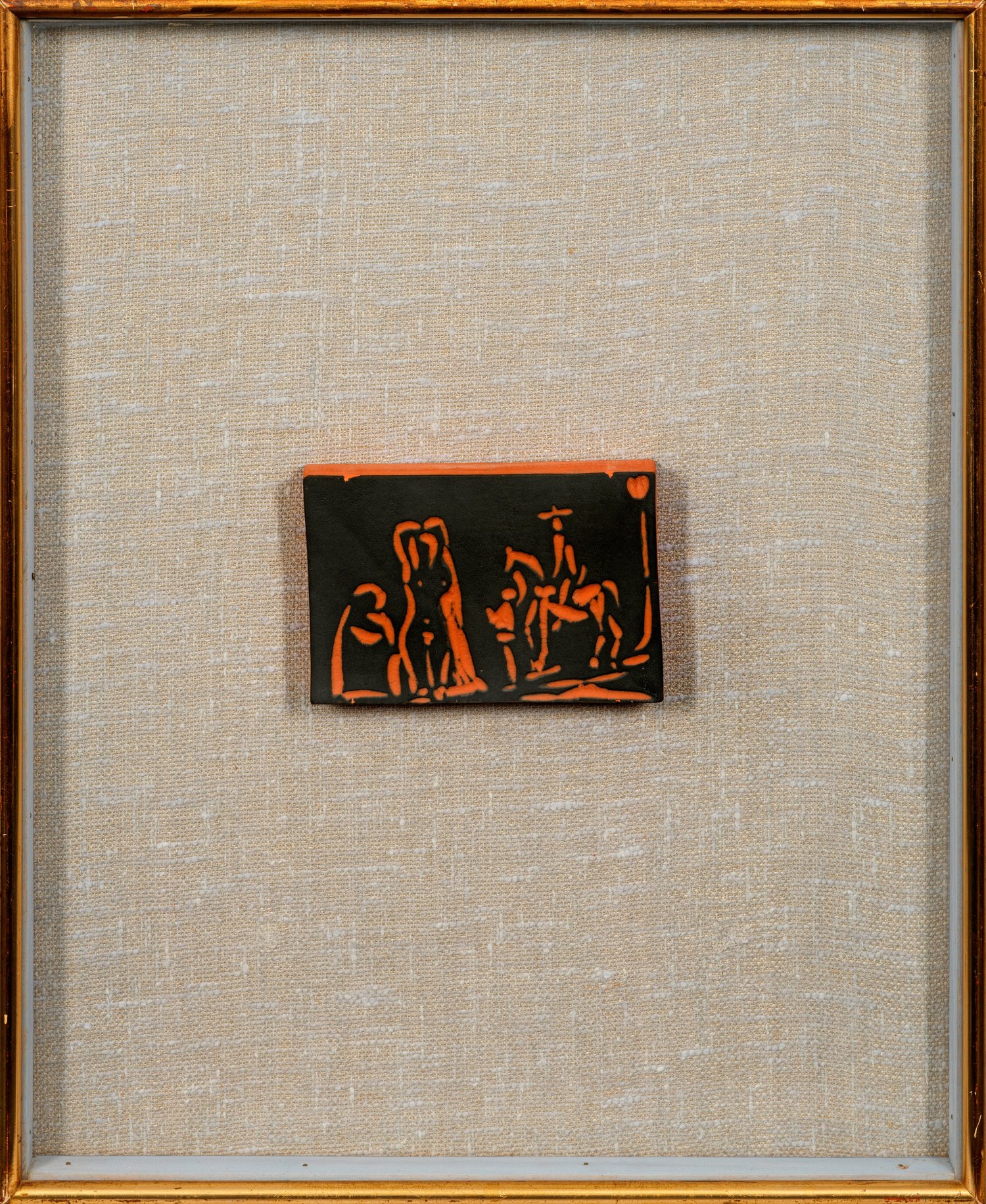 Terrakotta. Breite, rechteckige Platte. Ziegelroter Scherben. Im leicht vertieften Spiegel Reiter und drei Figuren auf schwarzem, mit Engobe eingefärbtem Grund. Entw. Pablo Picasso, um 1968. Rücks. durch Rahmen verdeckt. Am Boden wohl Pressmarken "MADOURA PLEIN FEU" und "EMPREINTE ORIGINALE DE PICASSO". Minim. best.; Rahmen mit vergoldeter Leiste. Sichtmaß Platte 10,6 cm x 16,5 cm. Rahmen 56 cm x 46,5 cm.