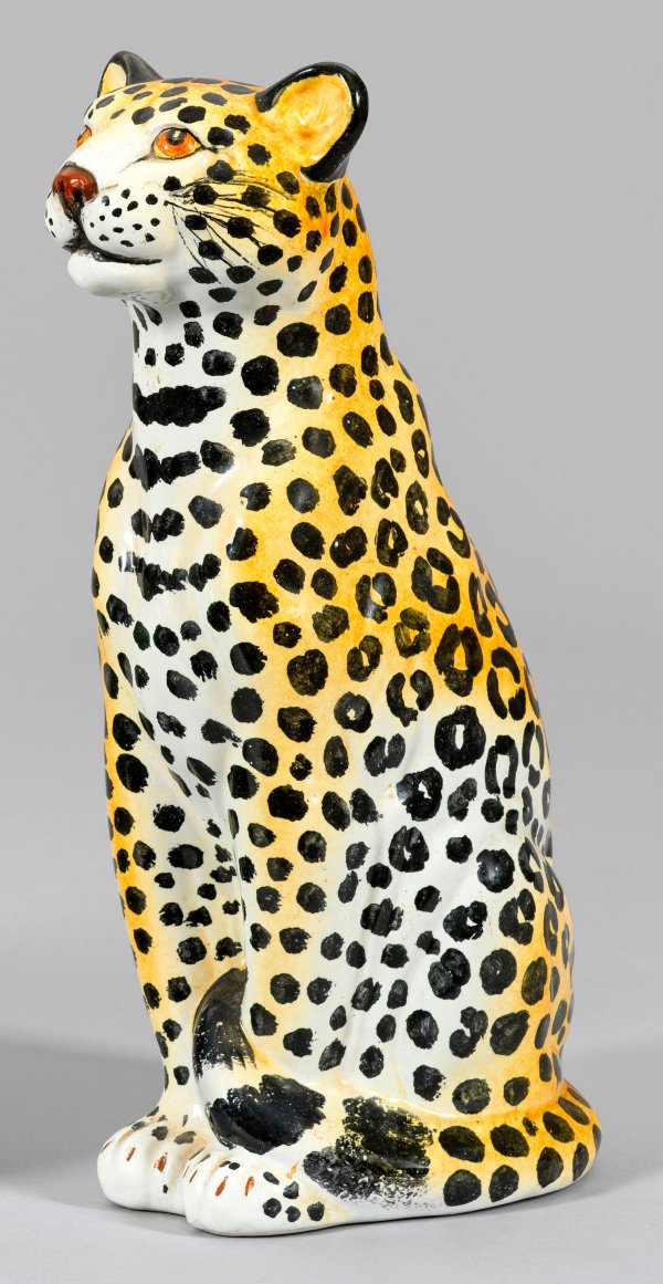 A modern decorative Italian glazed and painted ceramic leopard figure. Marked "MADE IN ITALY".
