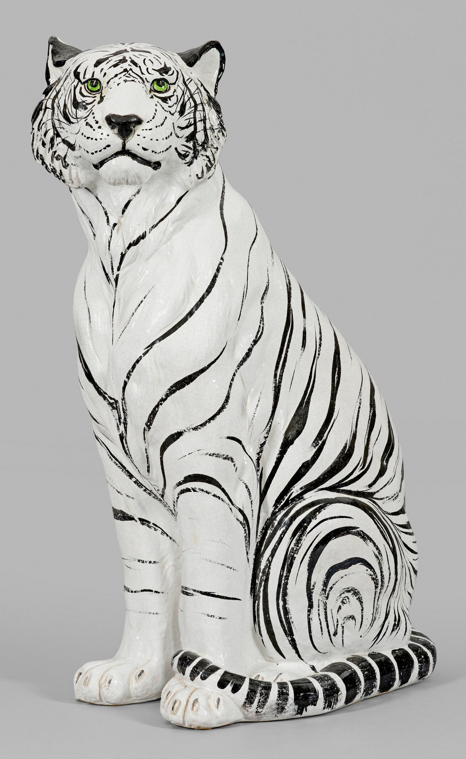 Keramik. Vollplastische, naturalistische Darstellung des sitzenden, schwarz-weiß gestreiften Tigers mit leuchtend grünen Augen. Polychrom staffiert. Ger. Glasurdefekte. H. 83,5 cm.