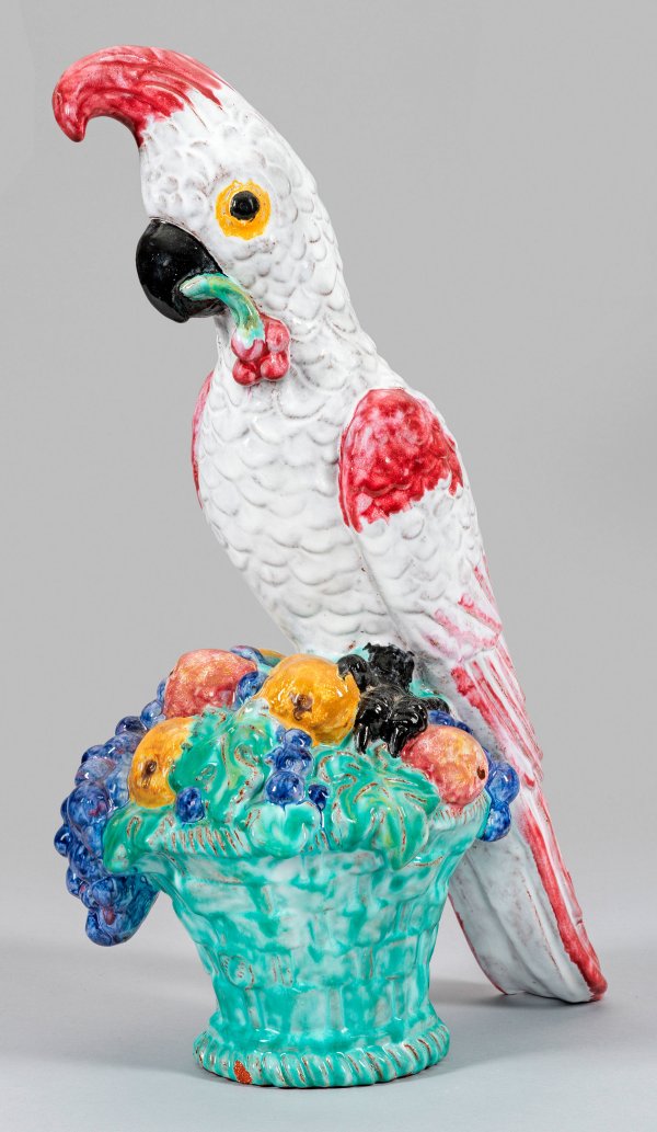 Majolika. Polychrom bemalt und glasiert sowie vollplastisch gearbeitet. Auf einem Blumenkorb mit Früchten sitzender Papagei mit einem Bündel Kirschen im Schnabel. Entw. Josef Wackerle für die Nymphenburger Manufaktur, um 1910. Modell-Nr. M 1/1. Teilw. unw. best.; Manufakturmarke. H. 52 cm.