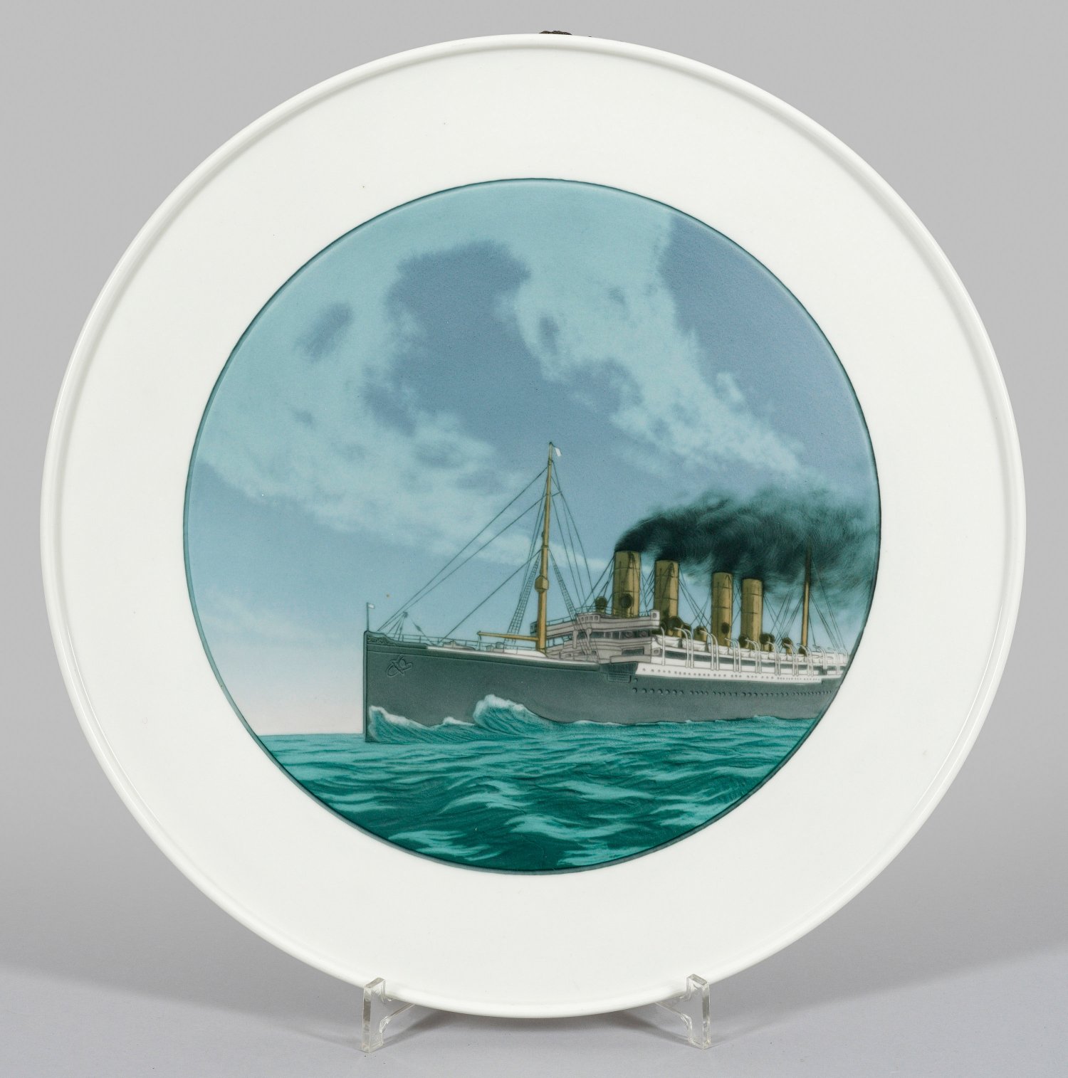 Flache Rundform mit leicht ausgestelltem Rand. Im konturierten Rund des Spiegels auf wellenbewegter See wohl die Darstellung des Schnelldampfers "Kaiser Wilhelm der Große". Polychrome Unterglasurmalerei. Entw. Theodor Schmuz-Baudiss und Arthur Kloepel, 1908. Malerzeichen für Arthur Kloepel. Rücks. Löcher zur Wandaufhängung. Jubiläumsmarke. Zepter- und Malereimarke. D. 42 cm.